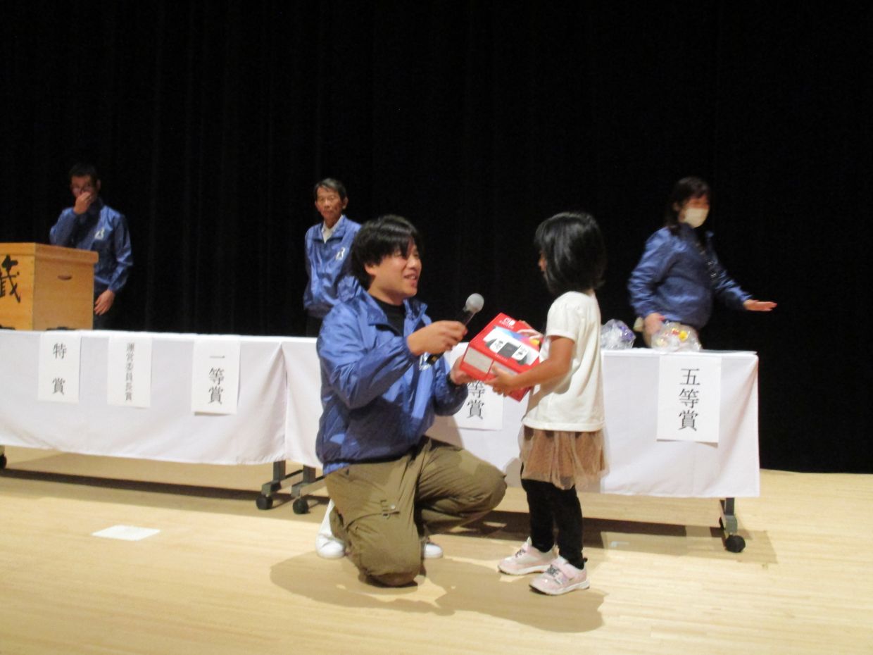 特賞の<ニンテンドースイッチ>に当選した女の子へ東島運営委員がインタビューするも、恥ずかしがってしまいコメント貰うのにも