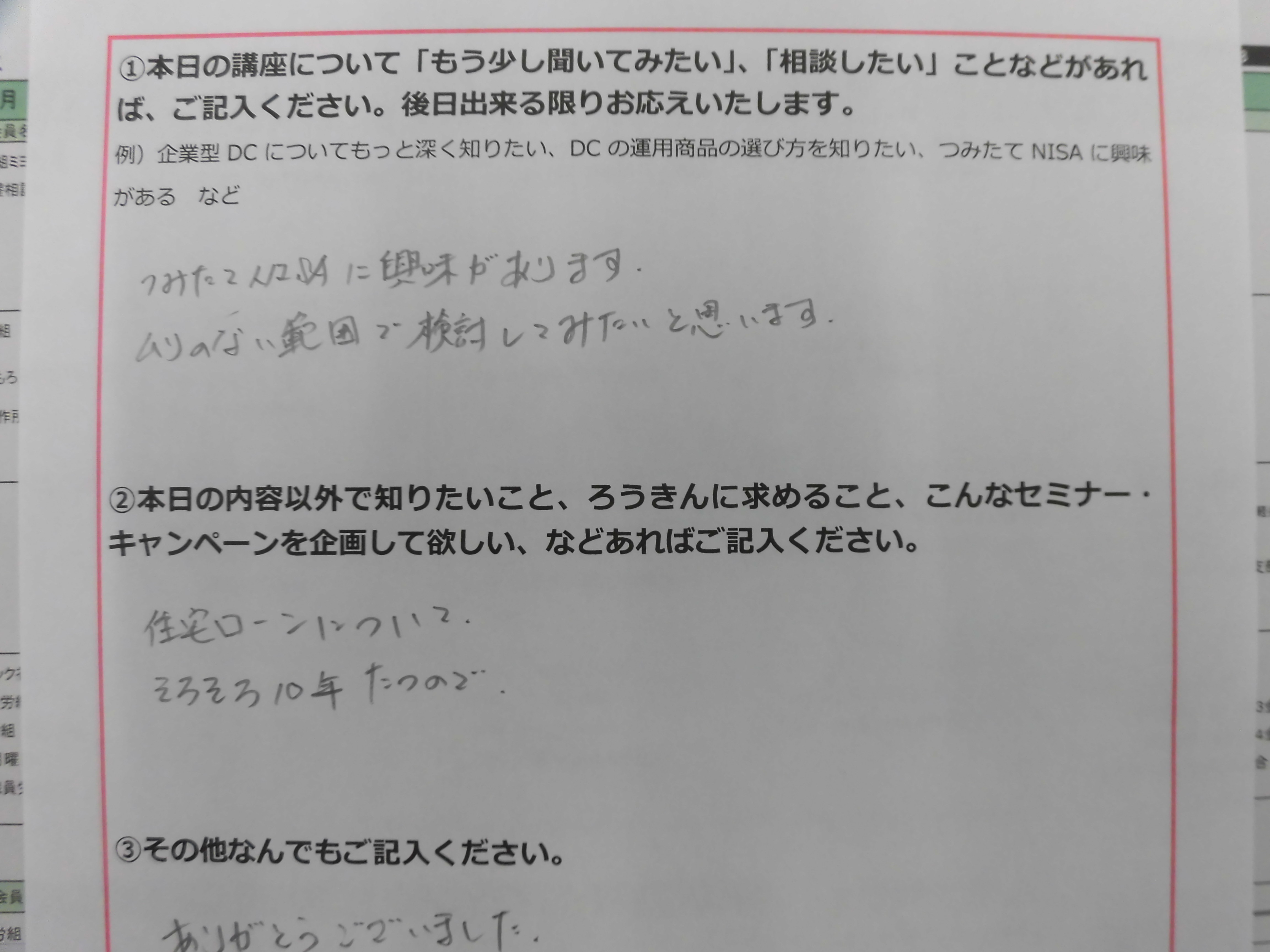 講義後のアンケートでは、企業型DCはもちろんのこと、「つみたてNISA」についてもっと詳しく話を聞きたいなど、多くの要望をいただきました。
