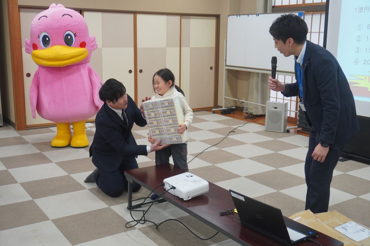 また、寄贈とあわせて、集まってくれた小学生のみなさんを対象に、お金に関するクイズ大会、題して、
