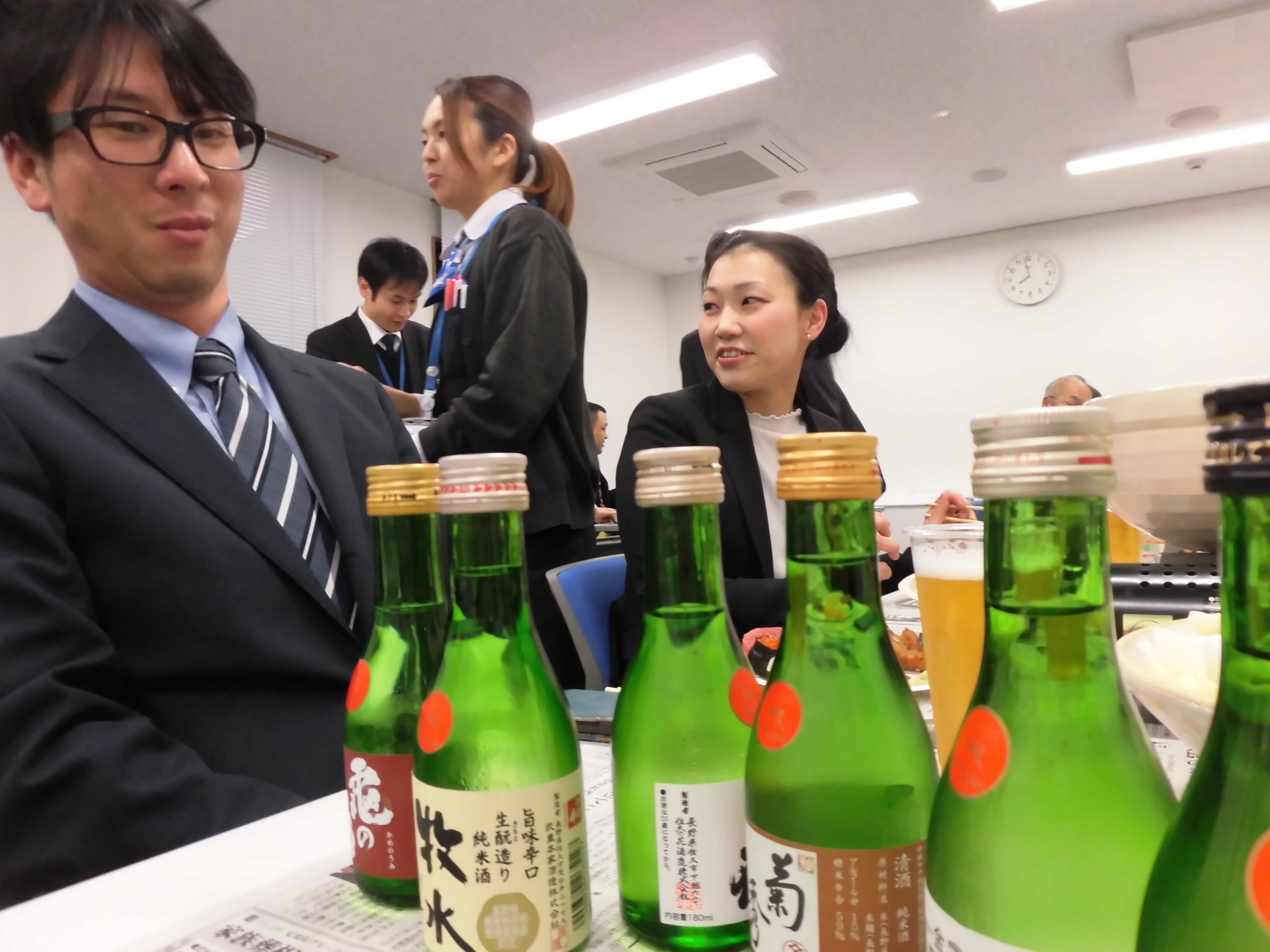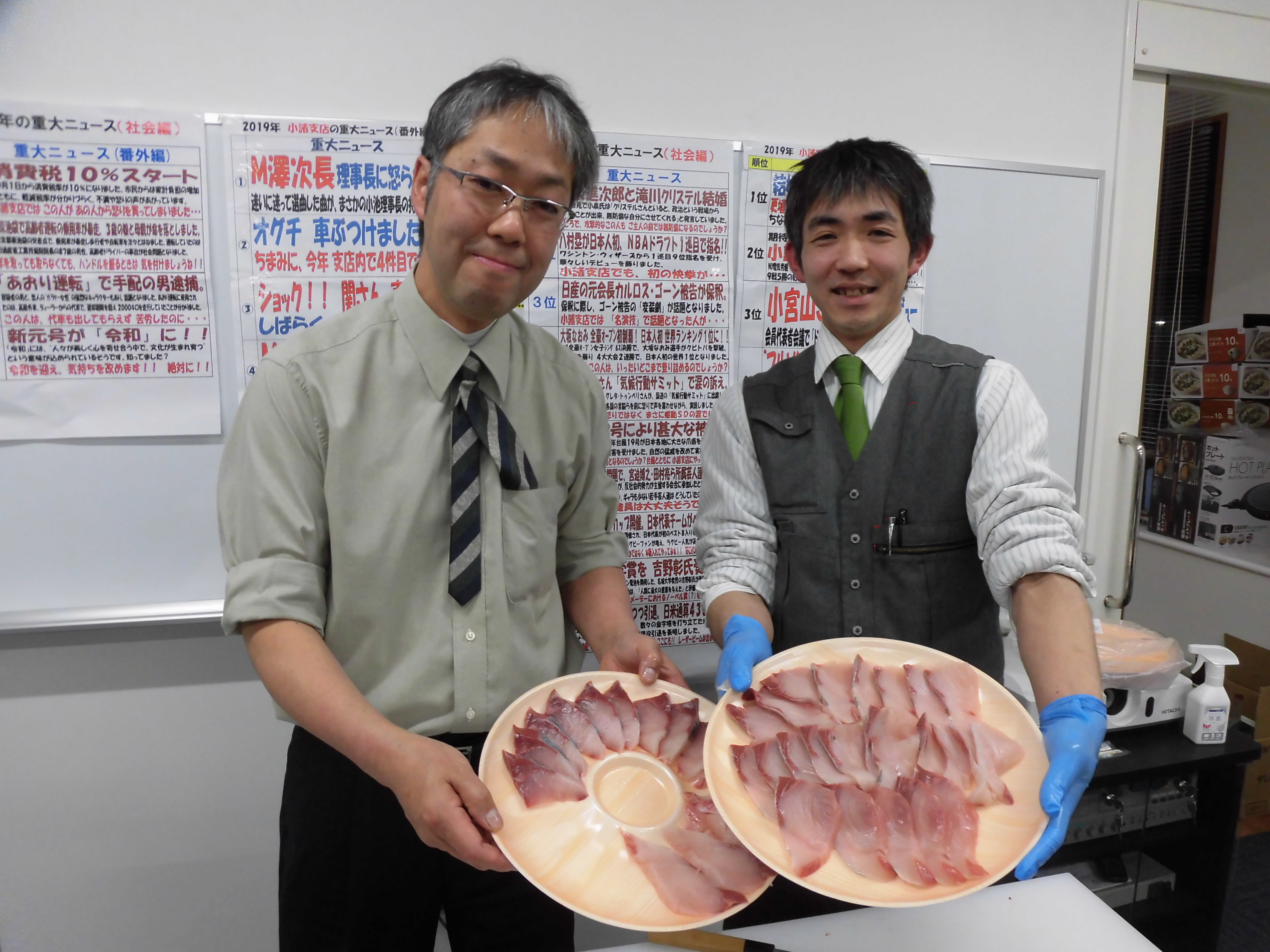 いつも通り支店の2Fにて行われた会議ですが、会議後に同会場で新年会の目玉企画として 「ブリの解体ショー&地酒13蔵呑み比べ」 を行いました!