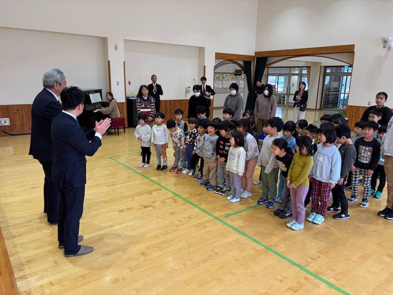 園長先生に代表して絵本を贈呈させていただき、保育園からはお礼として園児のみなさんから元気いっぱいな歌のお返しをいただきました。子どもたちのの歌に感動し、運営委員長・支店長もつい涙ぐむ場面がありました。
