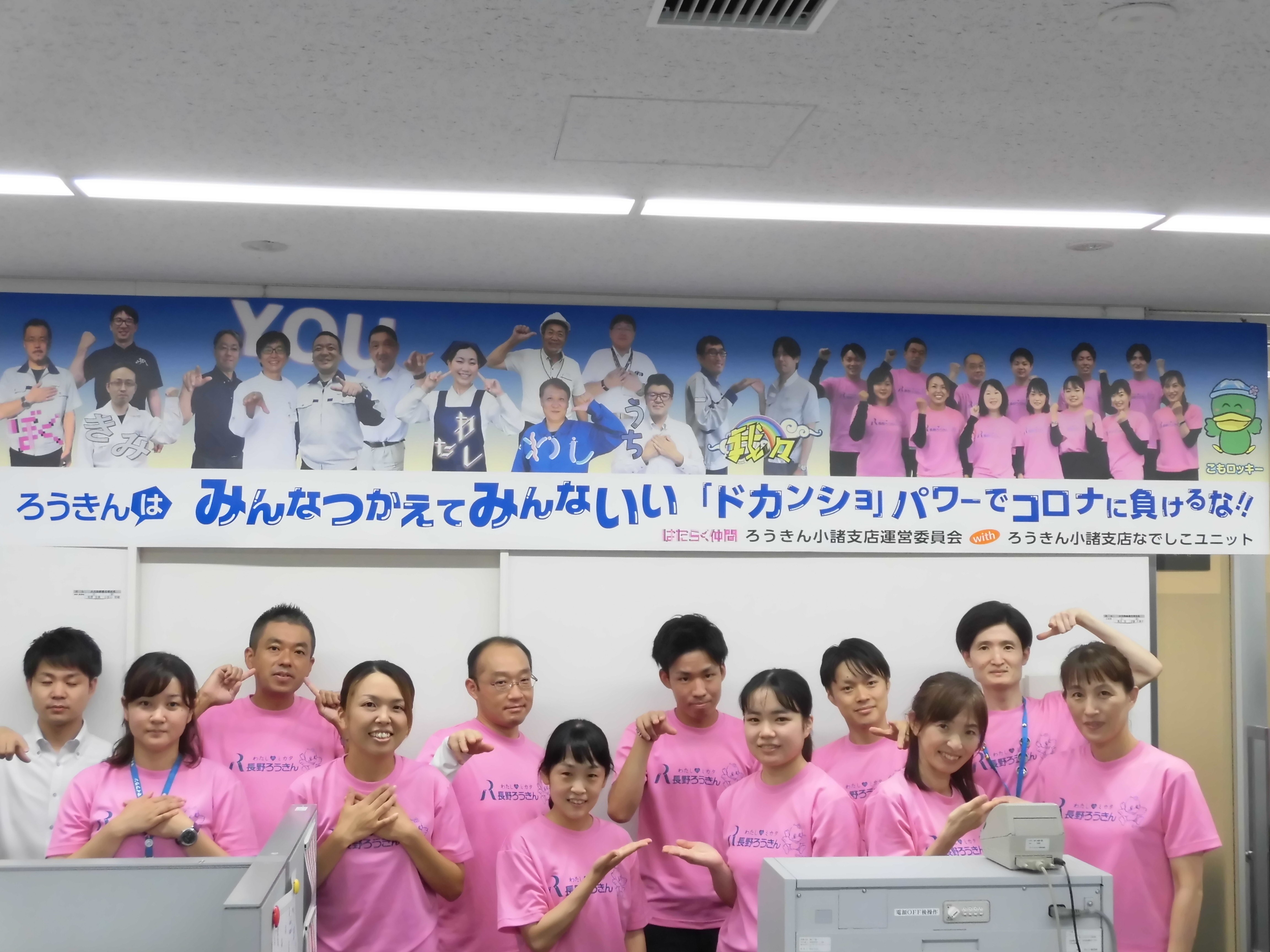なでしこピンクTシャツの小諸支店職員と、職場の制服を着た運営委員さんにご協力をいただき作成。