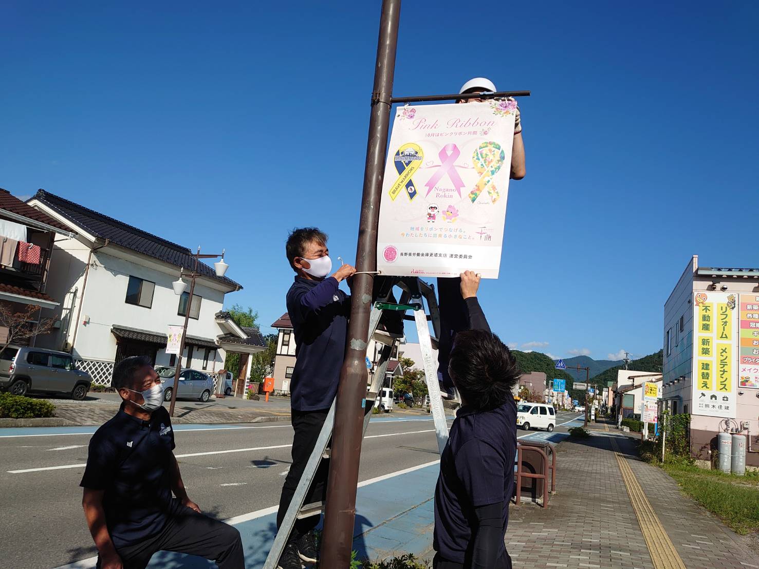 フラッグは、地域をリボンでつなげる”をイメージして、千曲市出身の現代アーティスト「越ちひろ」さんと「信州ブレイブウォリアーズ」、そして長野ろうきんのピンクリボンをつなげたイメージになっており、地域の方に活動を周知する良い機会となりました。街路灯のフラッグは11月中旬までの予定で吊り下げられていますのでお時間のある方は是非ご覧ください。