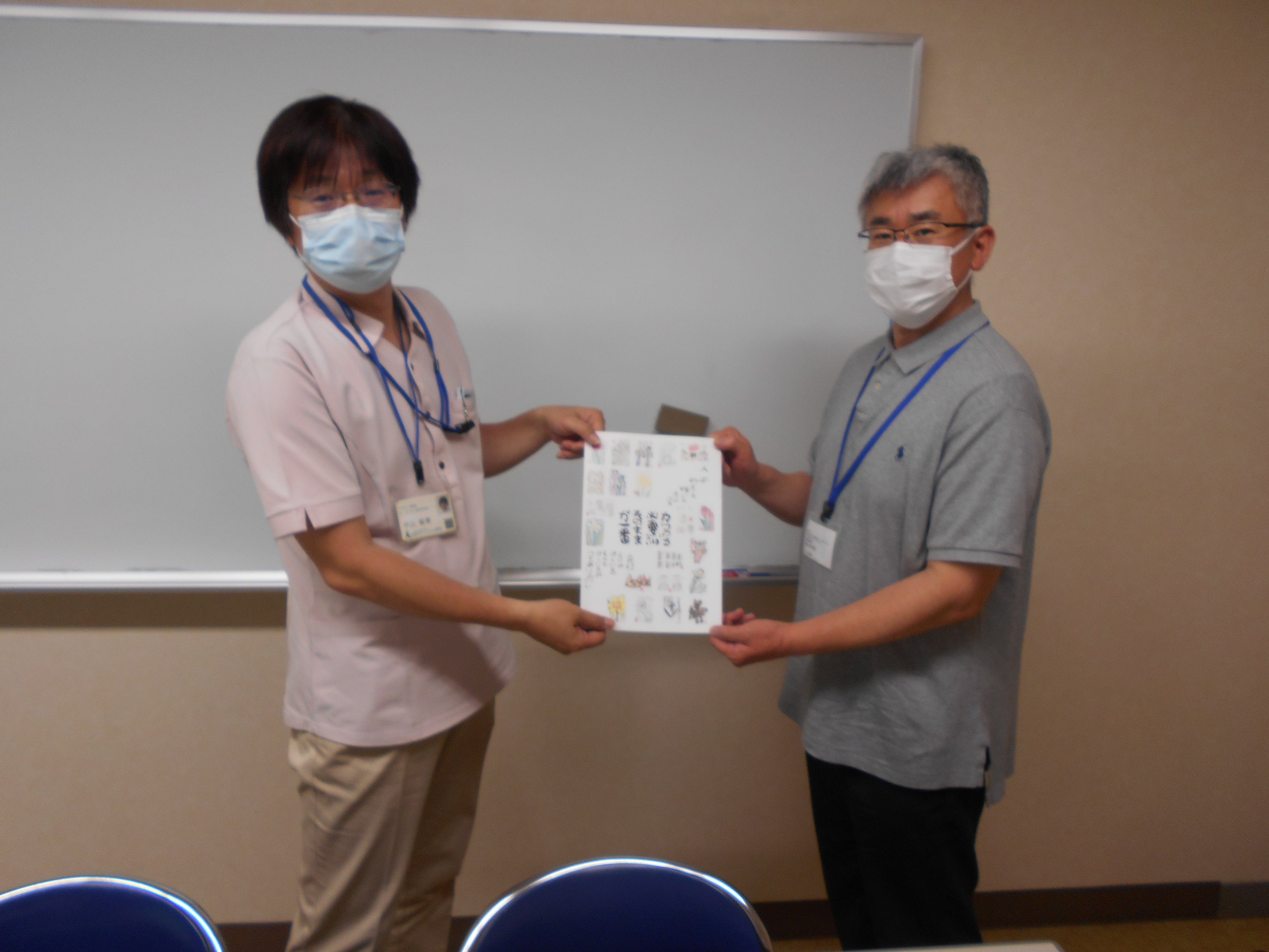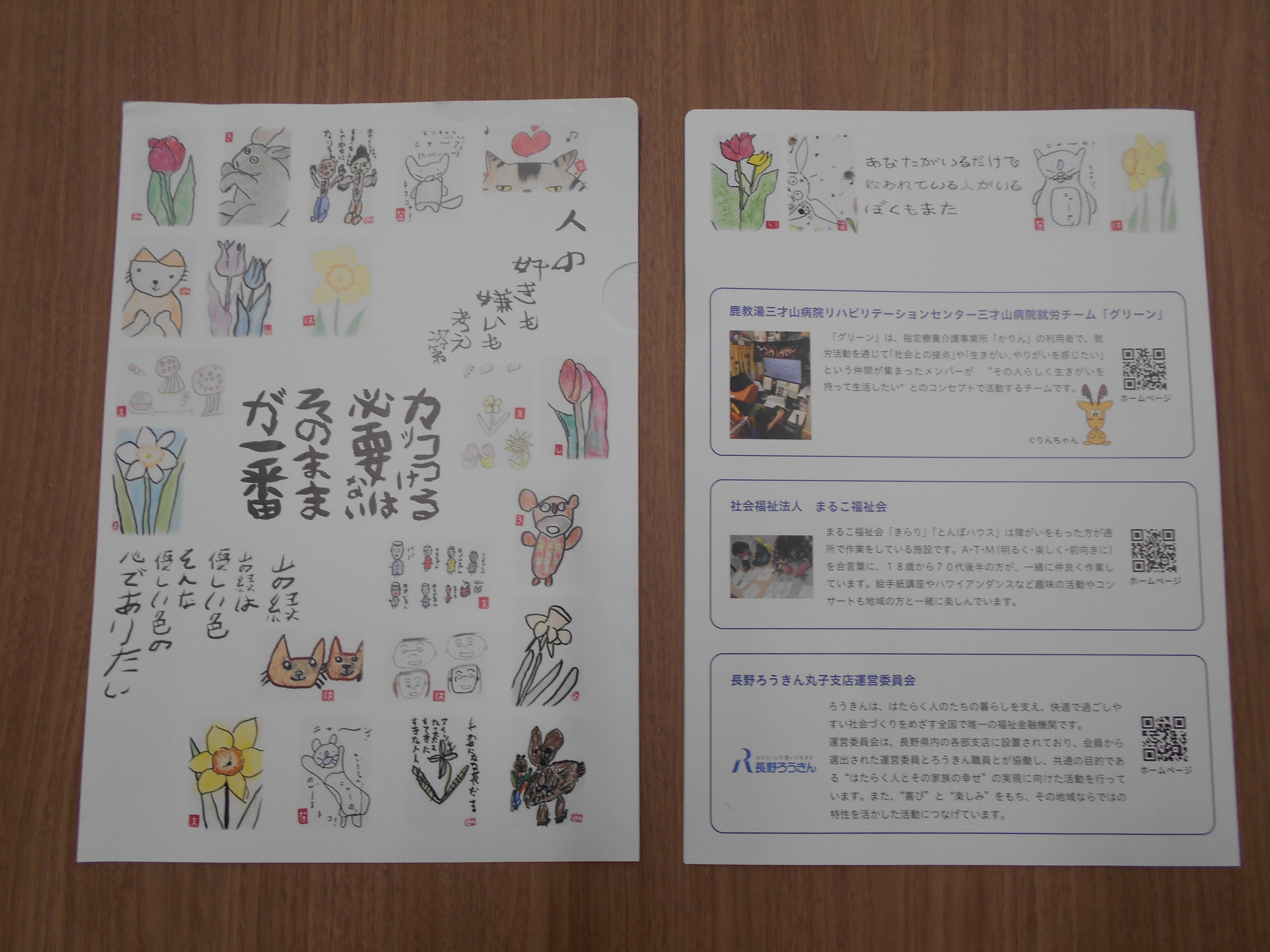 この度、“三才山病院就労チーム「グリーン」”、“社会福祉法人まるこ福祉会”の利用者の皆さまのご協力のもと作成した〈オリジナル紙ファイル〉が出来上がったため、依田運営委員長より双方の団体へ寄贈しました。