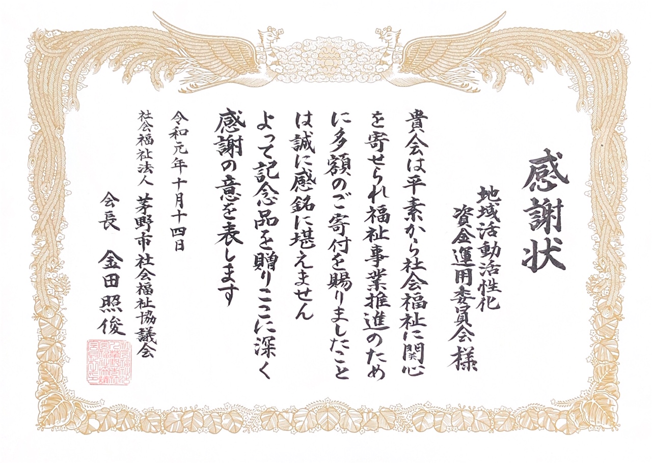 2018年度茅野支店アニメ祭りの寄付金に対する感謝状をいただきました。