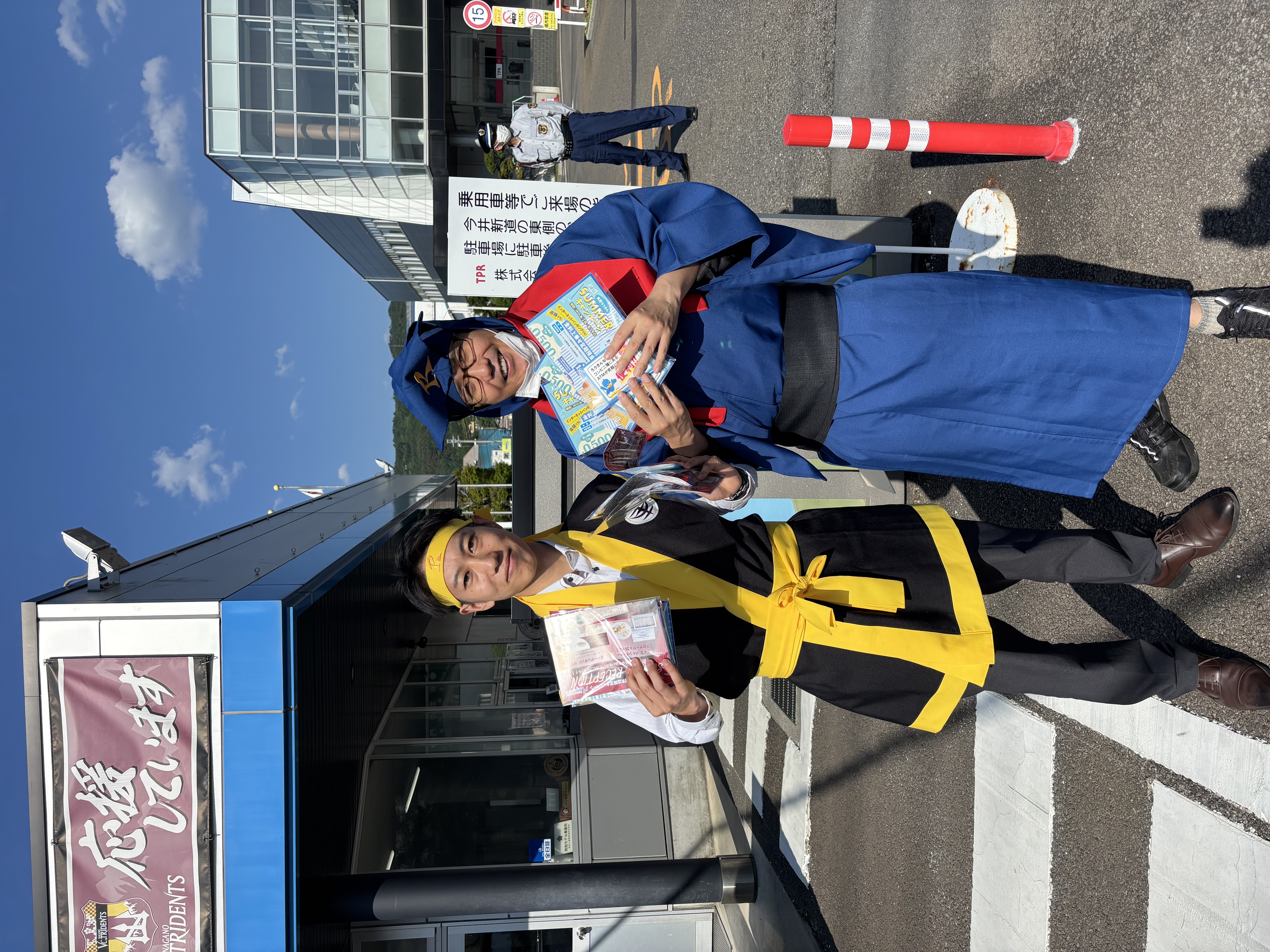 労組執行部や金融委員さん、さらには車天狗とくのいちも参上し、キャンペーンティッシュを配布しました。