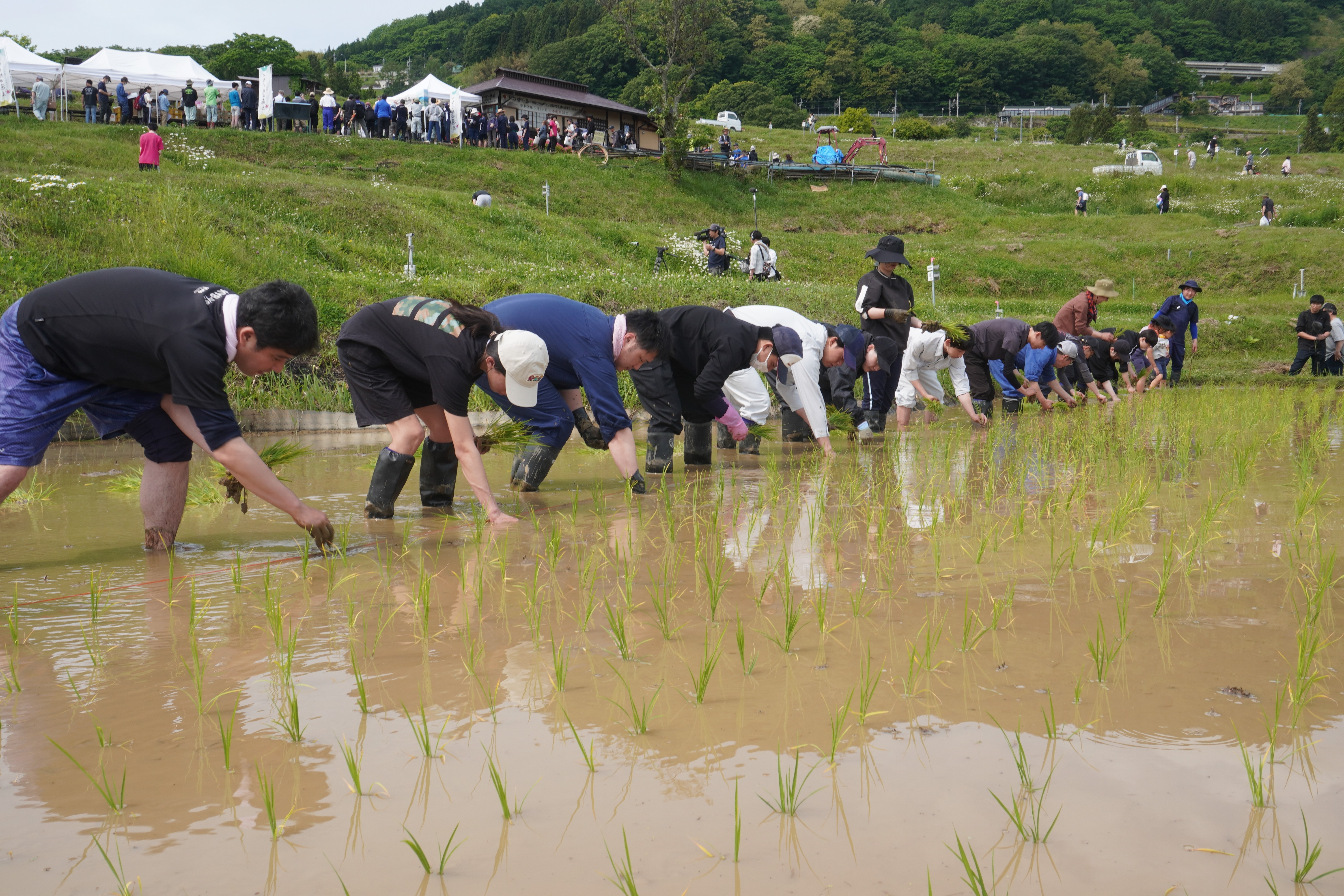 当日は雨の心配もありましたが、皆さんの日頃の行いが良いのか、田植えの時間帯は見事に晴れ!心地よい天気の中、みんなで楽しく作業を進めることができました。